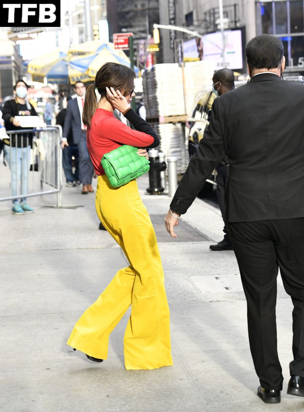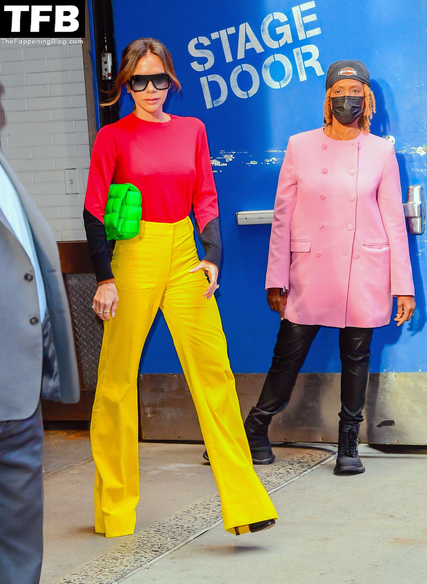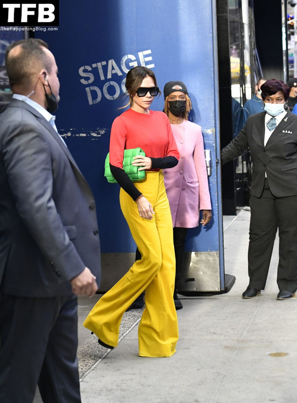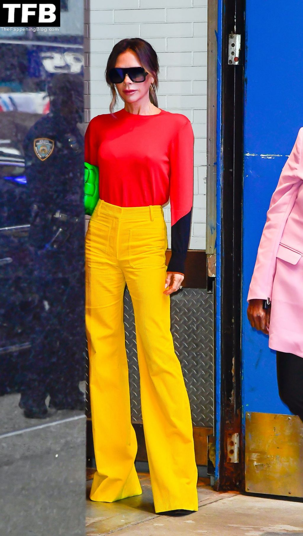 Victoria Beckham запечатлена в очень стильном образе по пути на шоу “Good Morning America”, где она продвигает свою новую линию одежды, обуви, сумок и косметики – Таймс-сквер, Манхэттен, 12.10.2021.