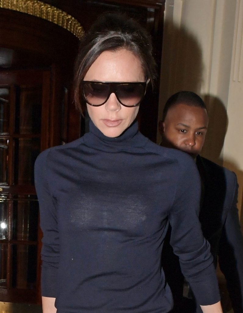 Victoria Beckham носит прозрачный черный топ, покидая свой отель в Лондоне, 02/01/2018. Виктория Бекхэм — английская модель, актриса, бизнесвумен, певица, дизайнер. Возраст – 43.