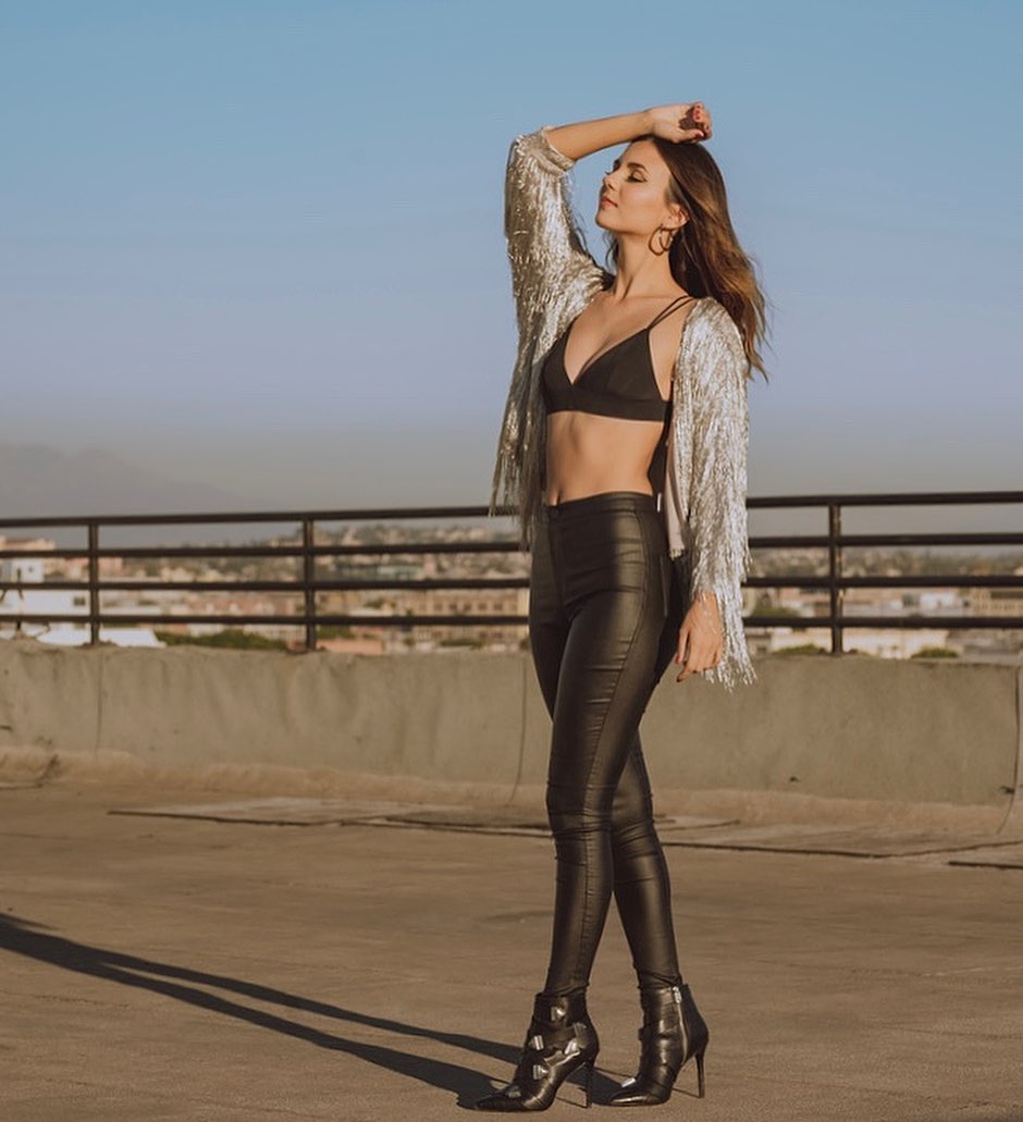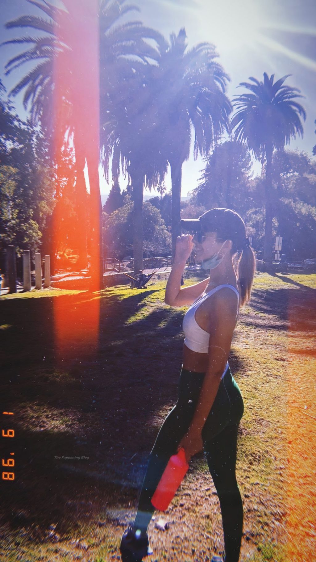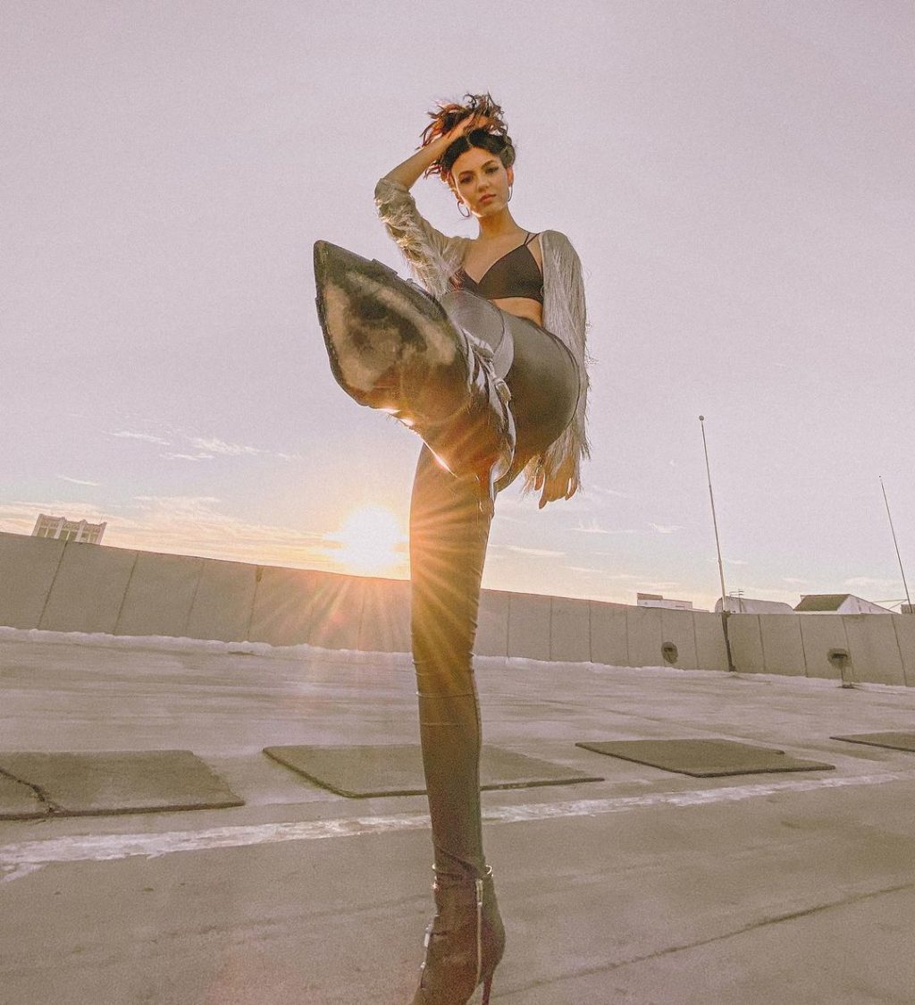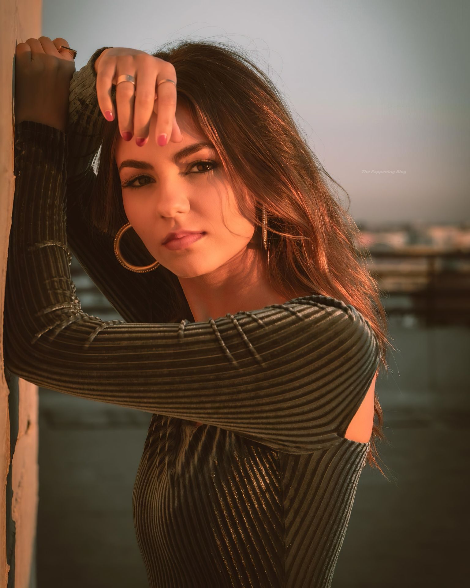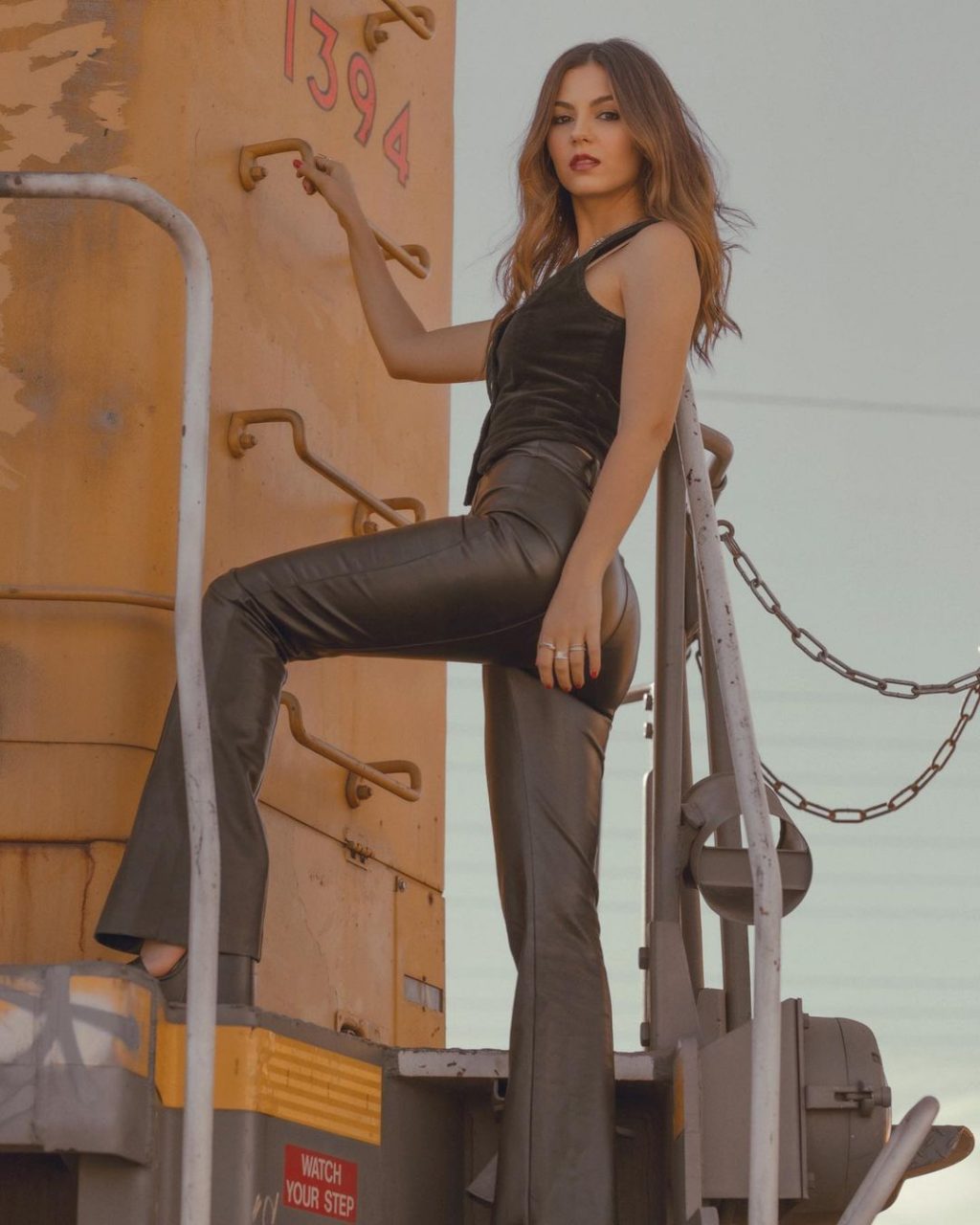 Звезда The Fappening Виктория Джастис демонстрирует свою крошечную попку, позируя в зелёных леггинсах и кожаных штанах для своих подписчиков – Instagram (2021).