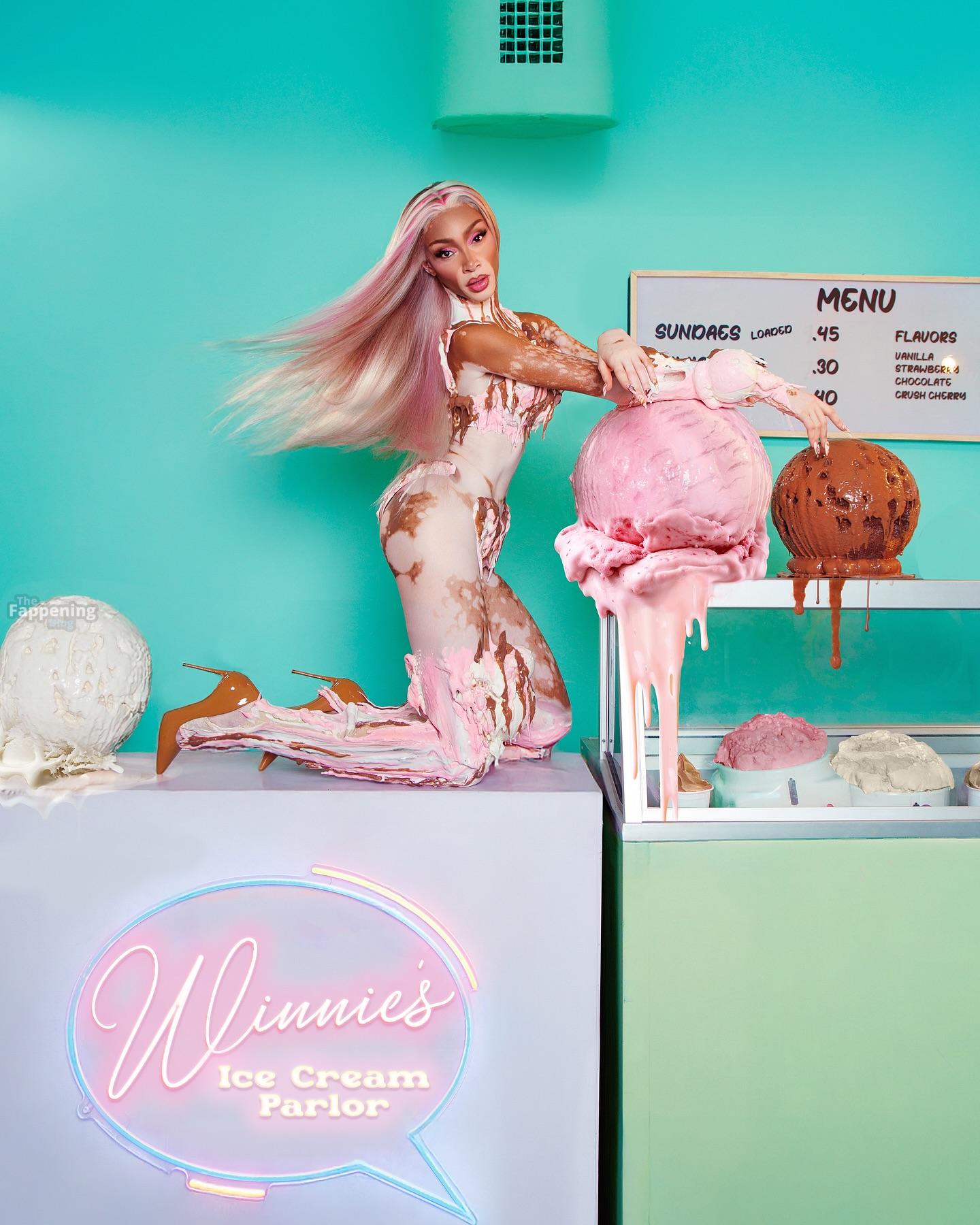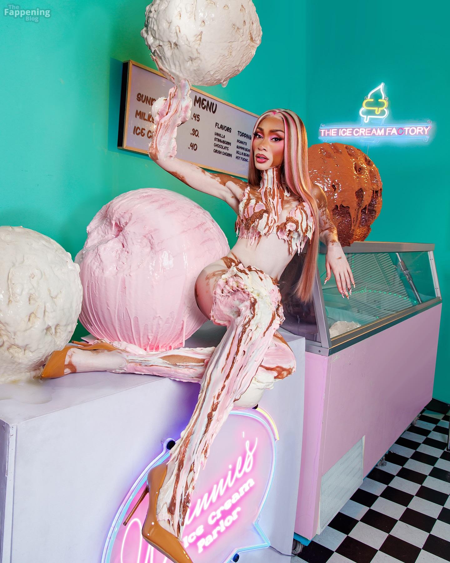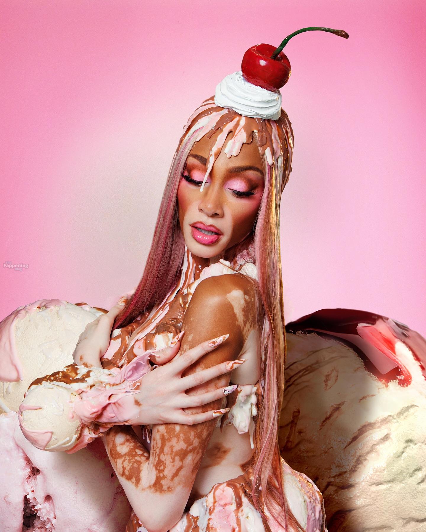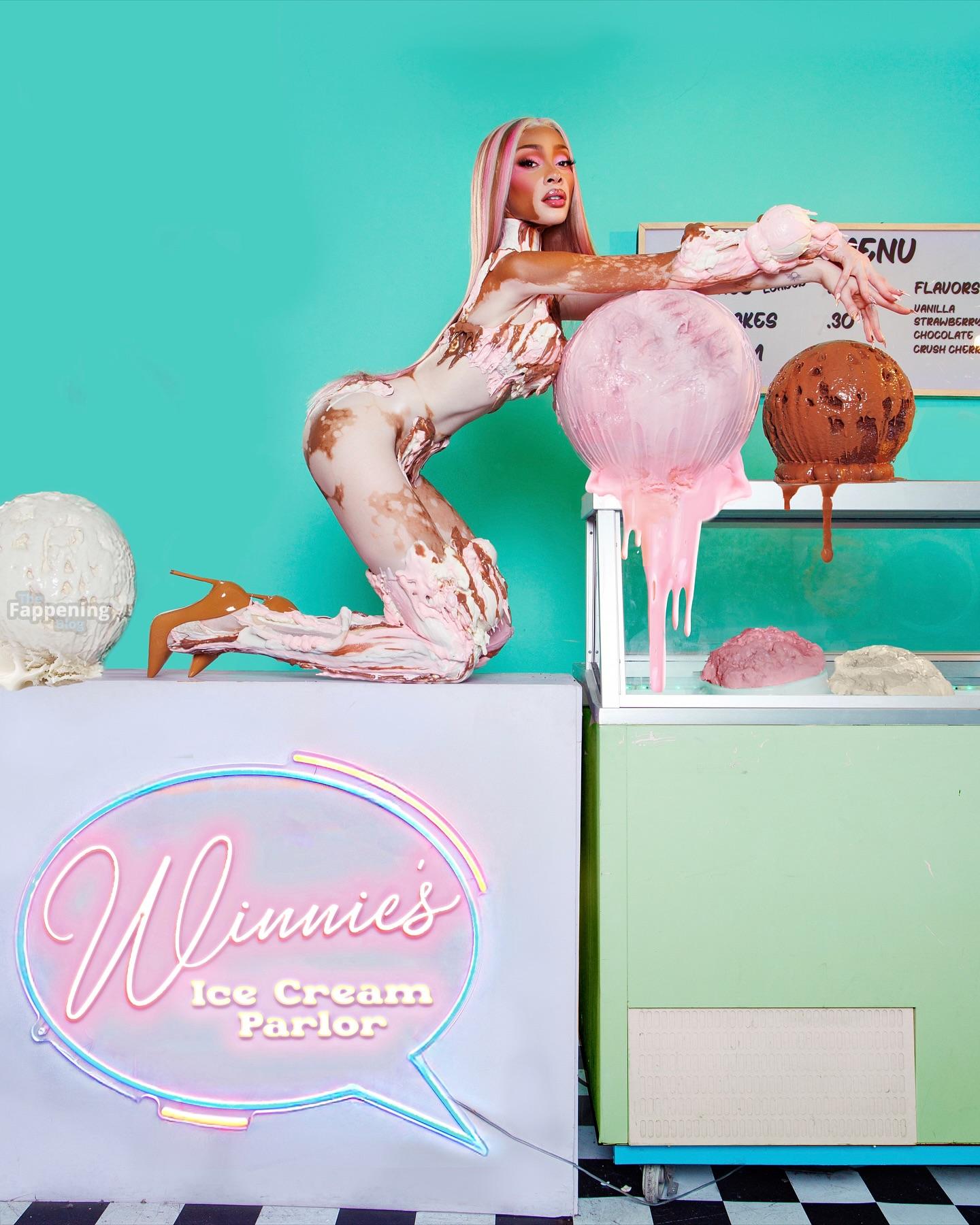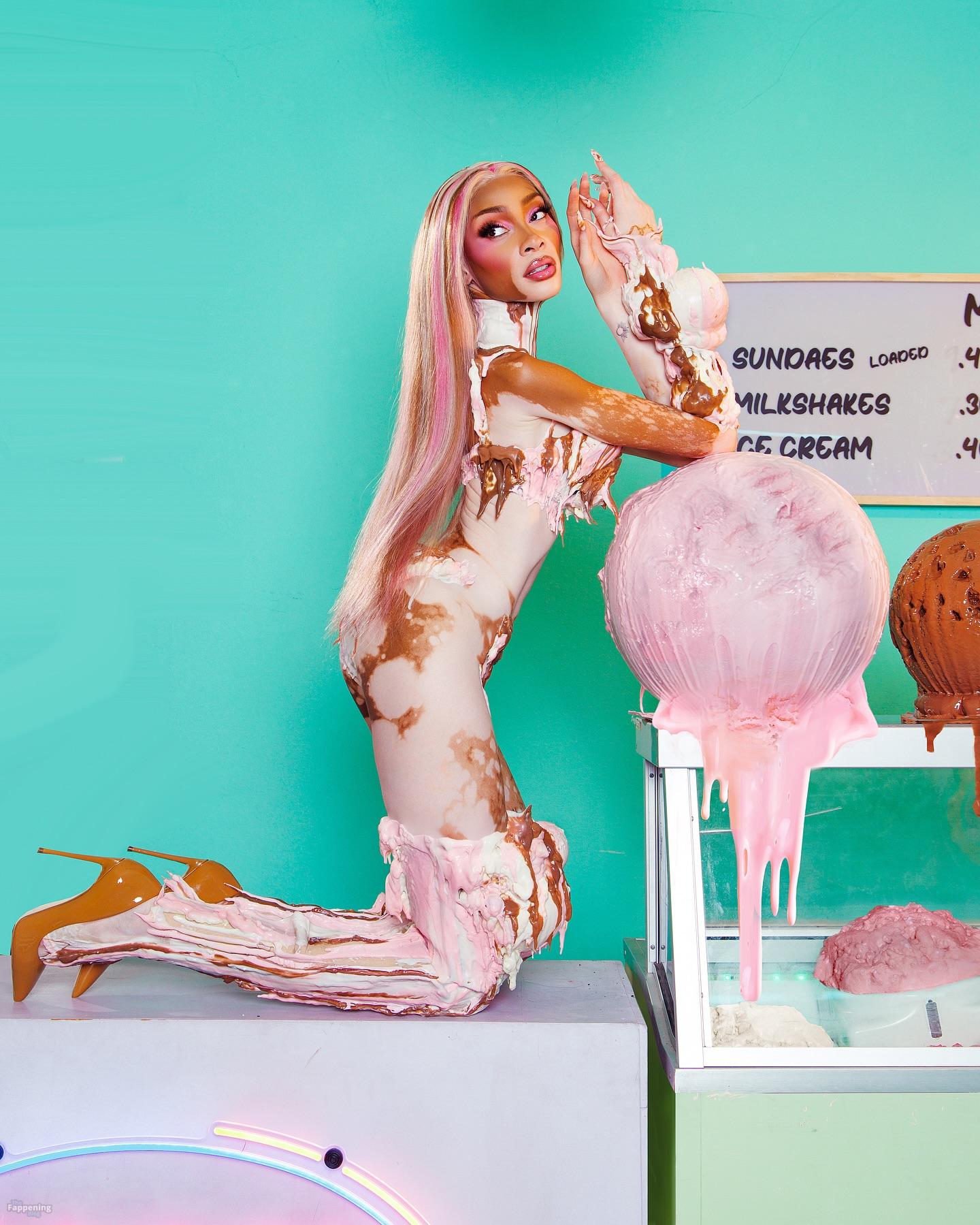 Винни Харлоу придумала самый оригинальный костюм на Хэллоуин в этом году. Она нарядилась в монстра мороженого. Это убийственная идея — сексуальная, полуобнажённая девушка, покрытая мороженым, страшная как ад. На фото модель с витилиго позирует в магазине мороженого, выглядя как часть меню. Ты бы слизал это сладкое белое мороженое с неё? Чёрт возьми, да.