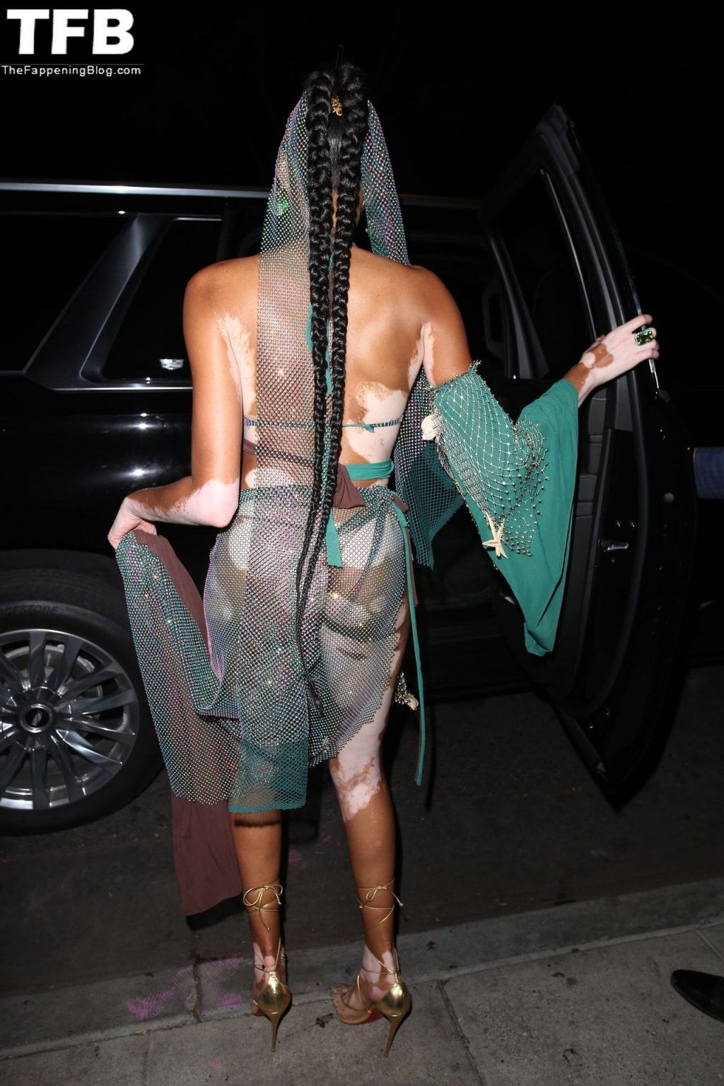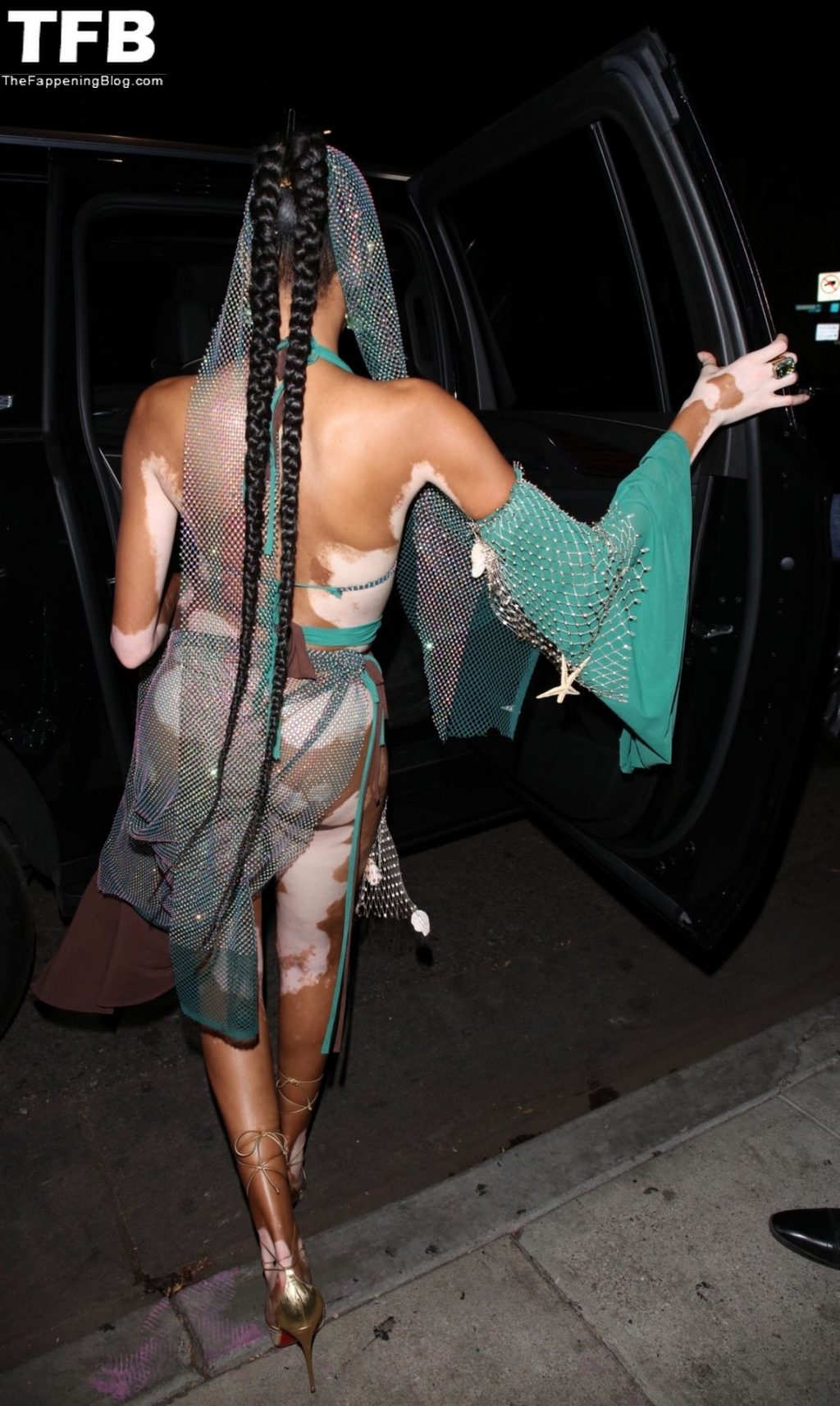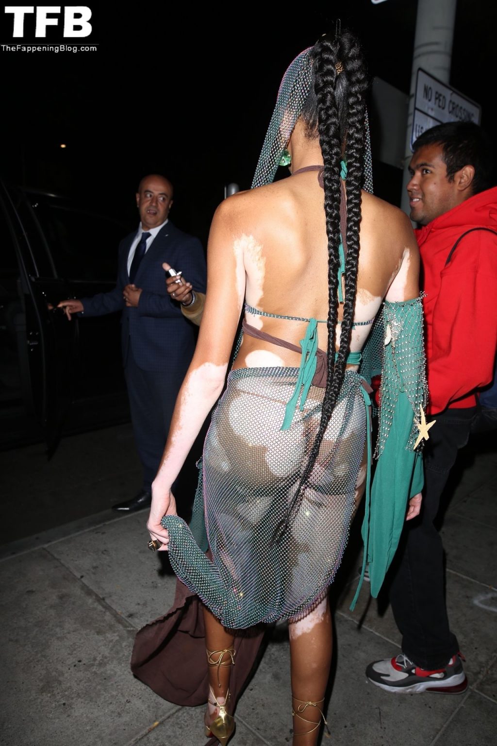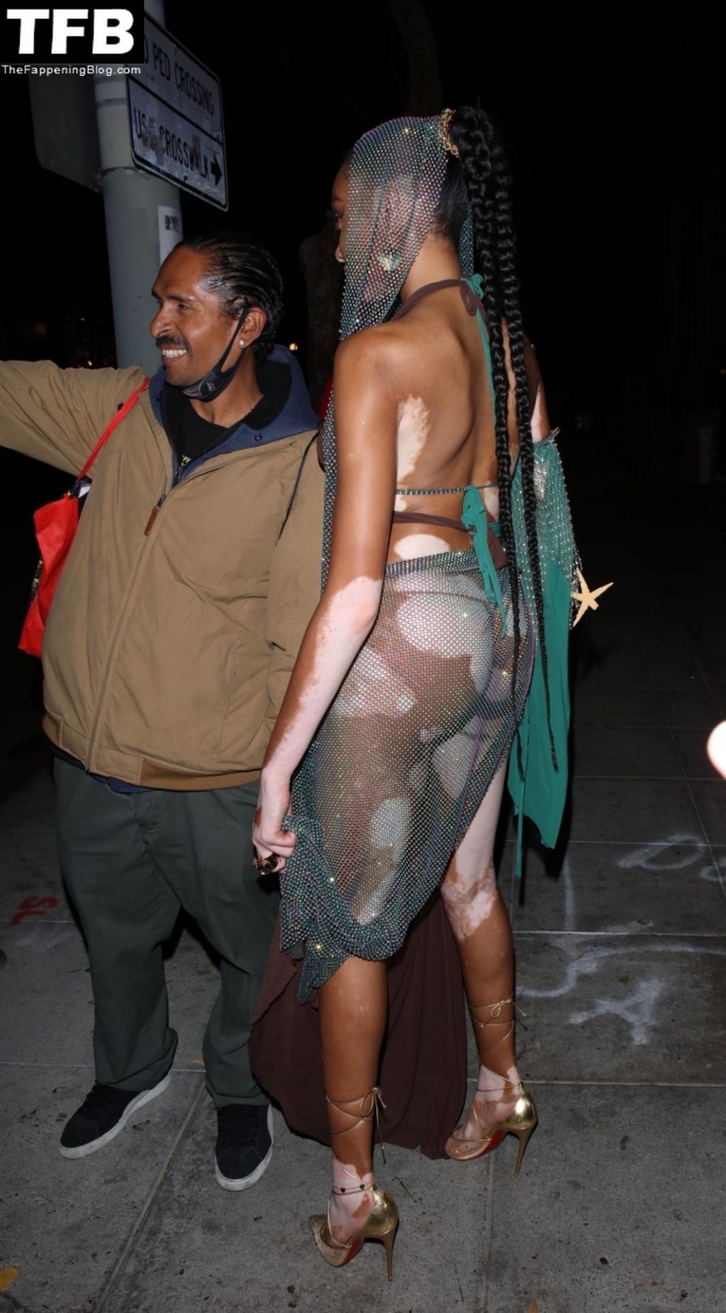 Винни Харлоу поражает в костюме на Хэллоуин на вечеринке по случаю дня рождения Doja Cat в Вест-Голливуде, 21.10.2021. Модель без бюстгальтера в прозрачном топе и юбке из сетки, оголяющей нижнюю часть, эффектно появляется на мероприятии.