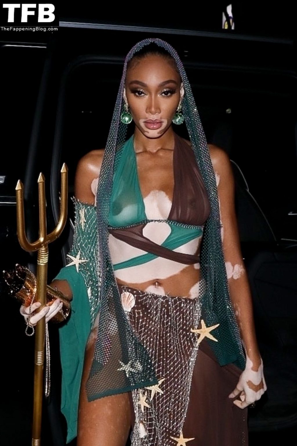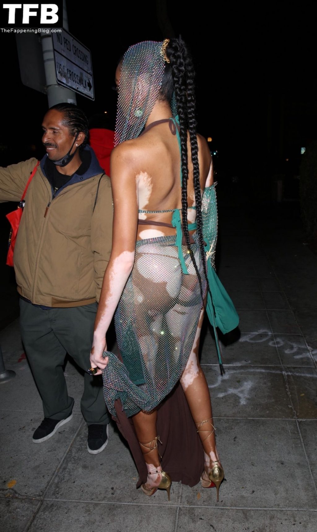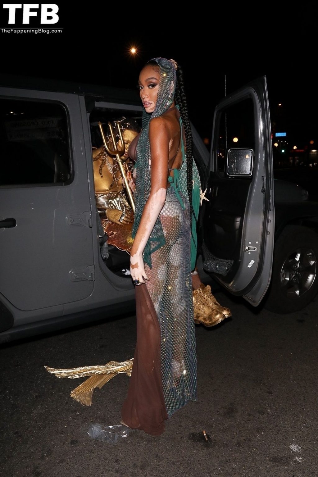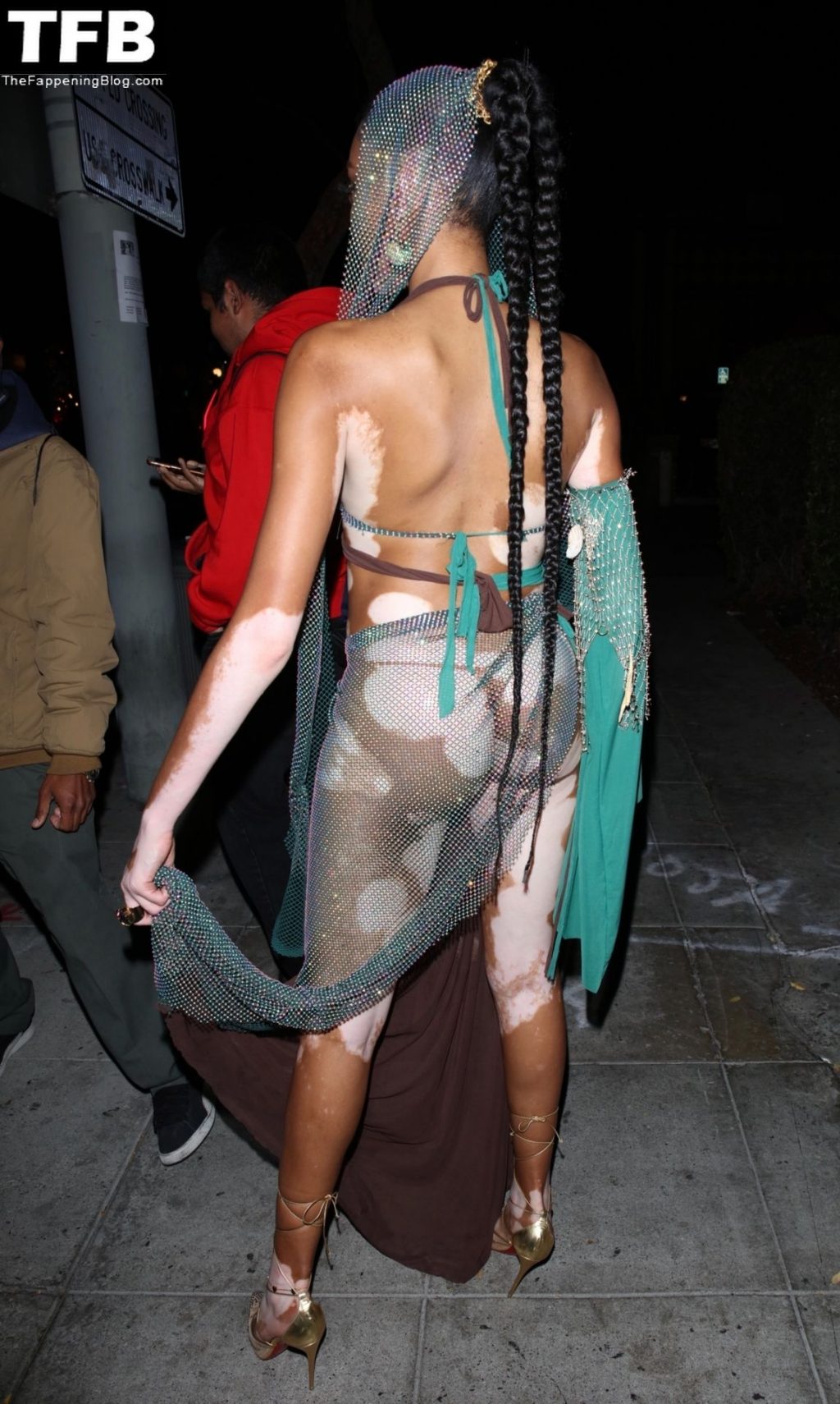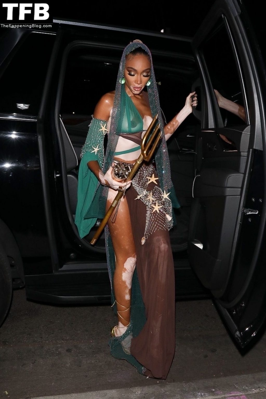 Винни Харлоу поражает в костюме на Хэллоуин на вечеринке по случаю дня рождения Doja Cat в Вест-Голливуде, 21.10.2021. Модель без бюстгальтера в прозрачном топе и юбке из сетки, оголяющей нижнюю часть, эффектно появляется на мероприятии.