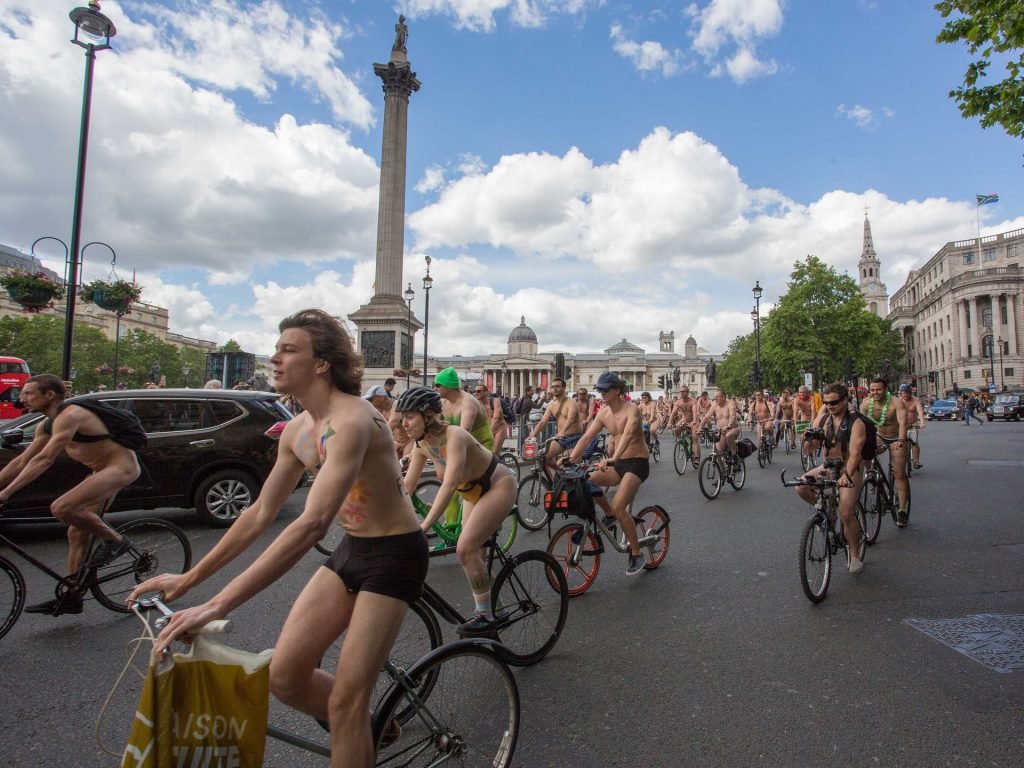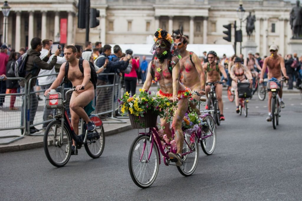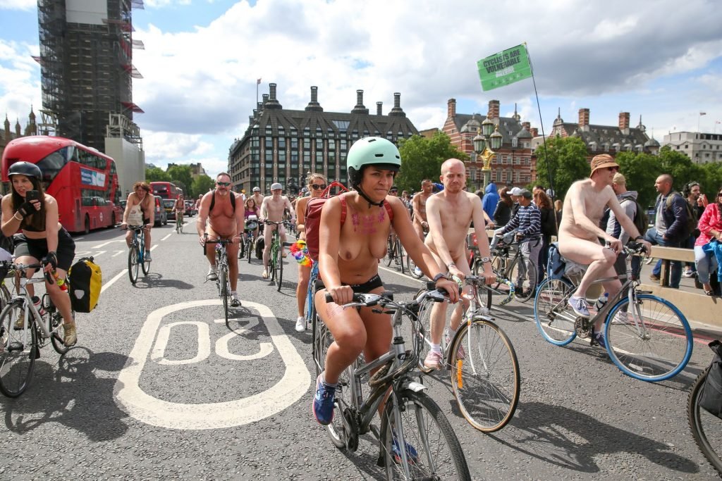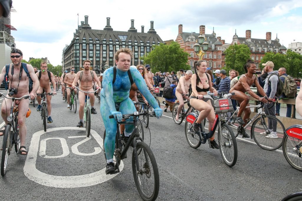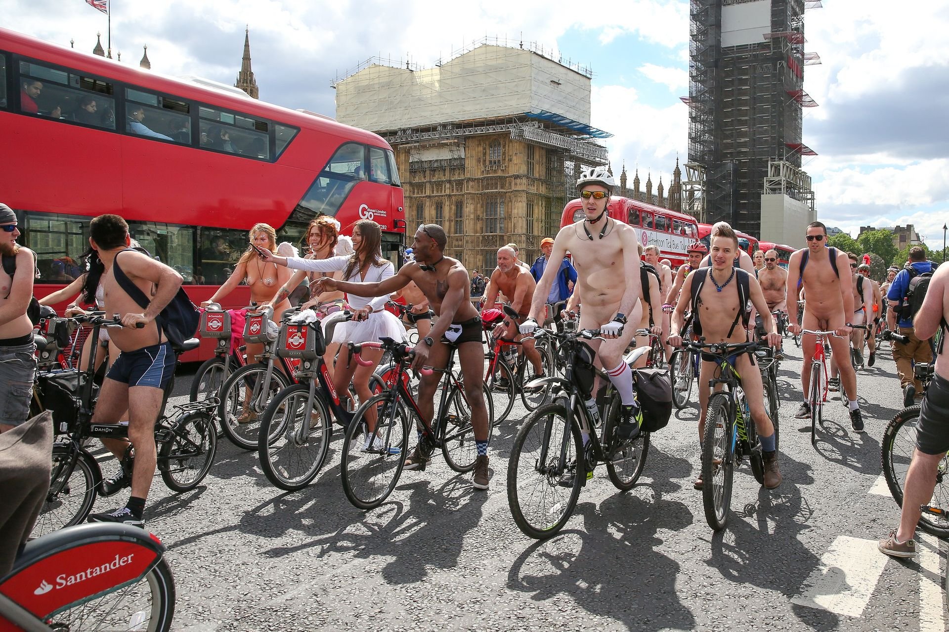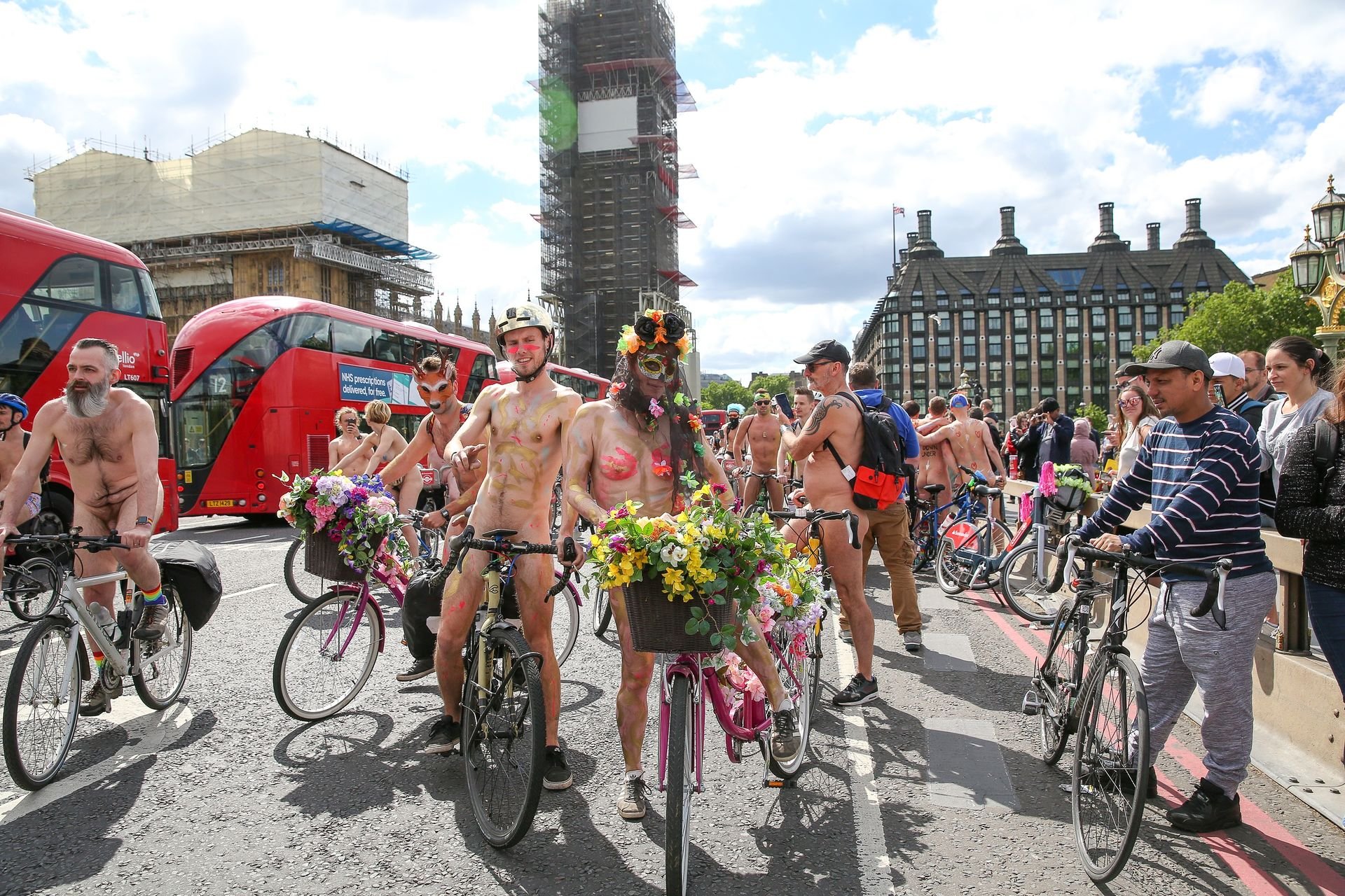 Нювелосипедисты принимают участие в 16-м ежегодном голом велопробеге, проезжая на велосипедах по Вестминстерскому мосту в рамках мероприятия Всемирного голого велопробега (WNBR), 06/08/2019. Участники демонстрируют уязвимость велосипедистов и протестуют против автомобильной культуры, повышая осведомленность о велосипедистах на дорогах.
