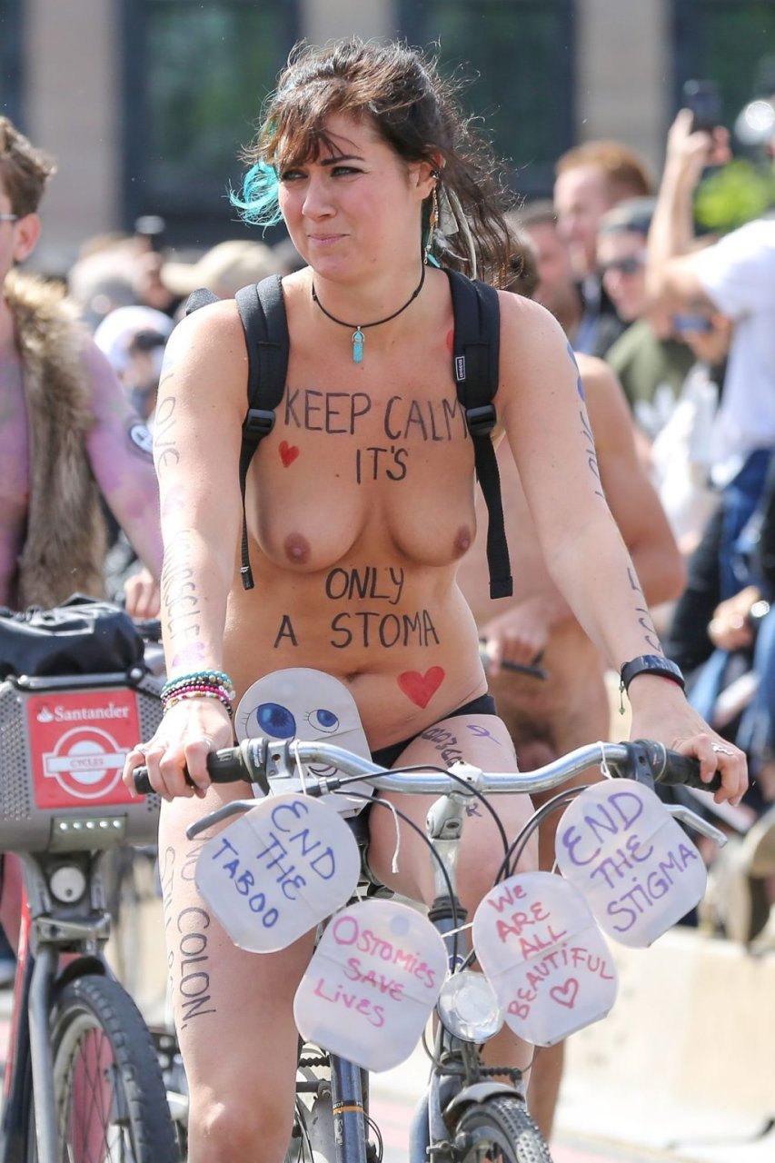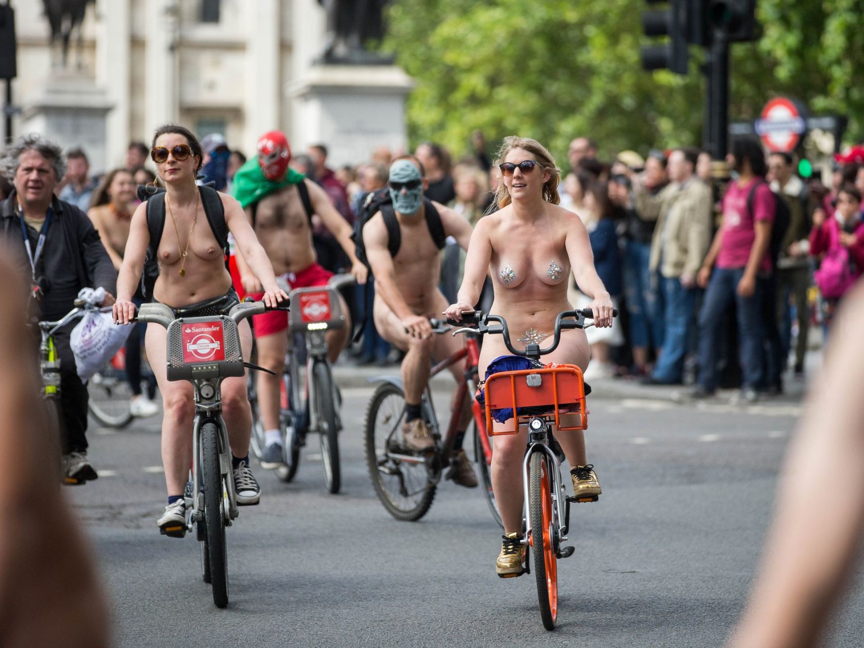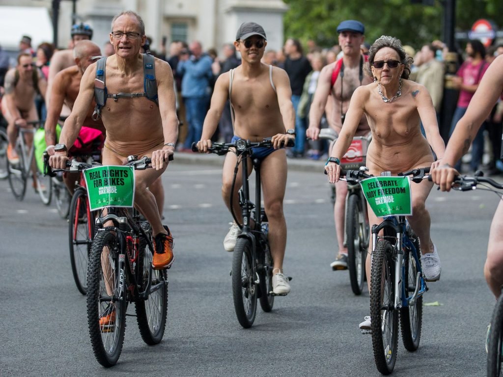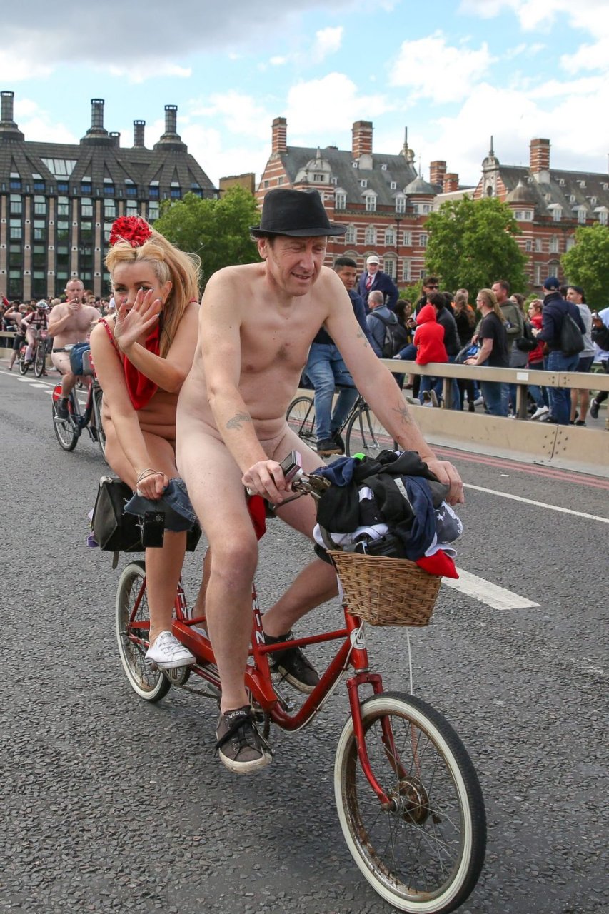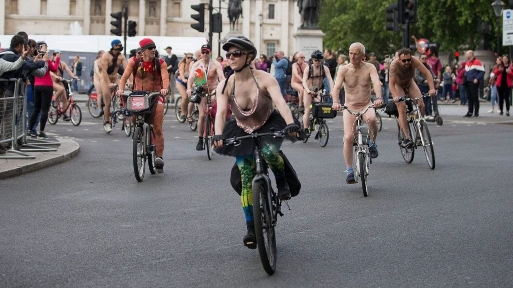 Нювелосипедисты принимают участие в 16-м ежегодном голом велопробеге, проезжая на велосипедах по Вестминстерскому мосту в рамках мероприятия Всемирного голого велопробега (WNBR), 06/08/2019. Участники демонстрируют уязвимость велосипедистов и протестуют против автомобильной культуры, повышая осведомленность о велосипедистах на дорогах.