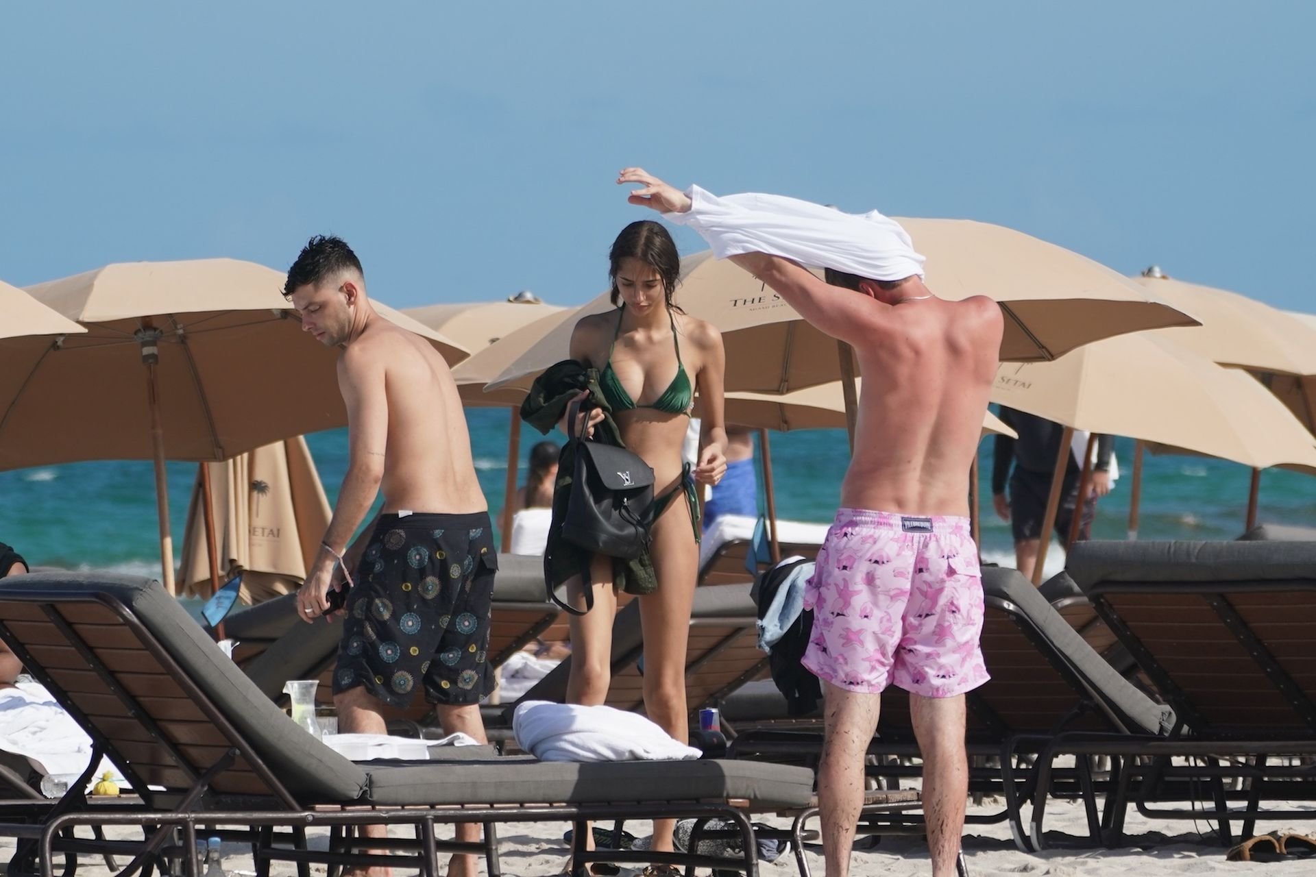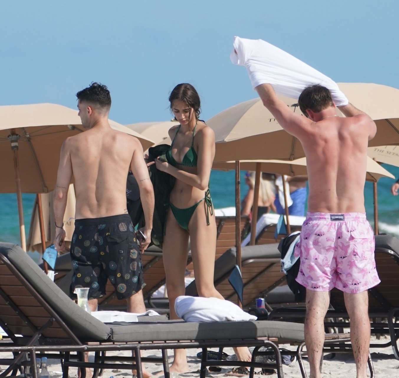 Худая голландская красотка Ясмин Вайнальдум была замечена в маленьком зелёном бикини на пляже в Майами-Бич, 11.05.2019. Модель Victoria’s Secret была в компании загадочного мужчины и друзей во время своего отдыха на солнце.