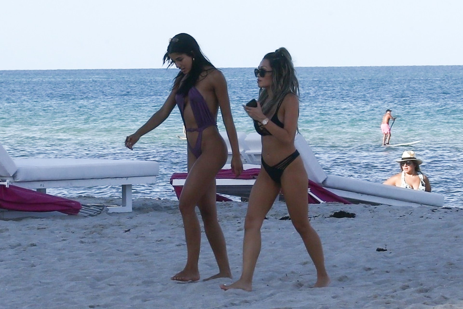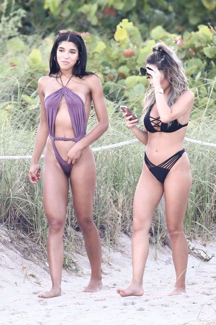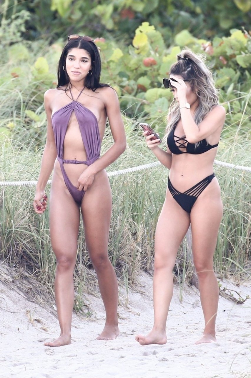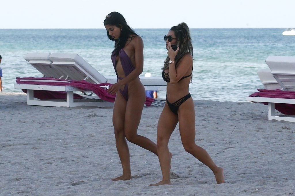 Модель и инфлюенсер в социальных сетях Йованна Вентура (22 года) блистает в смелом фиолетовом цельном купальнике на пляже в Майами, 12.08.2018. Предполагаемая бывшая девушка Джастина Бибера привлекала внимание вместе со своей подругой, когда они прогуливались по пляжу.
