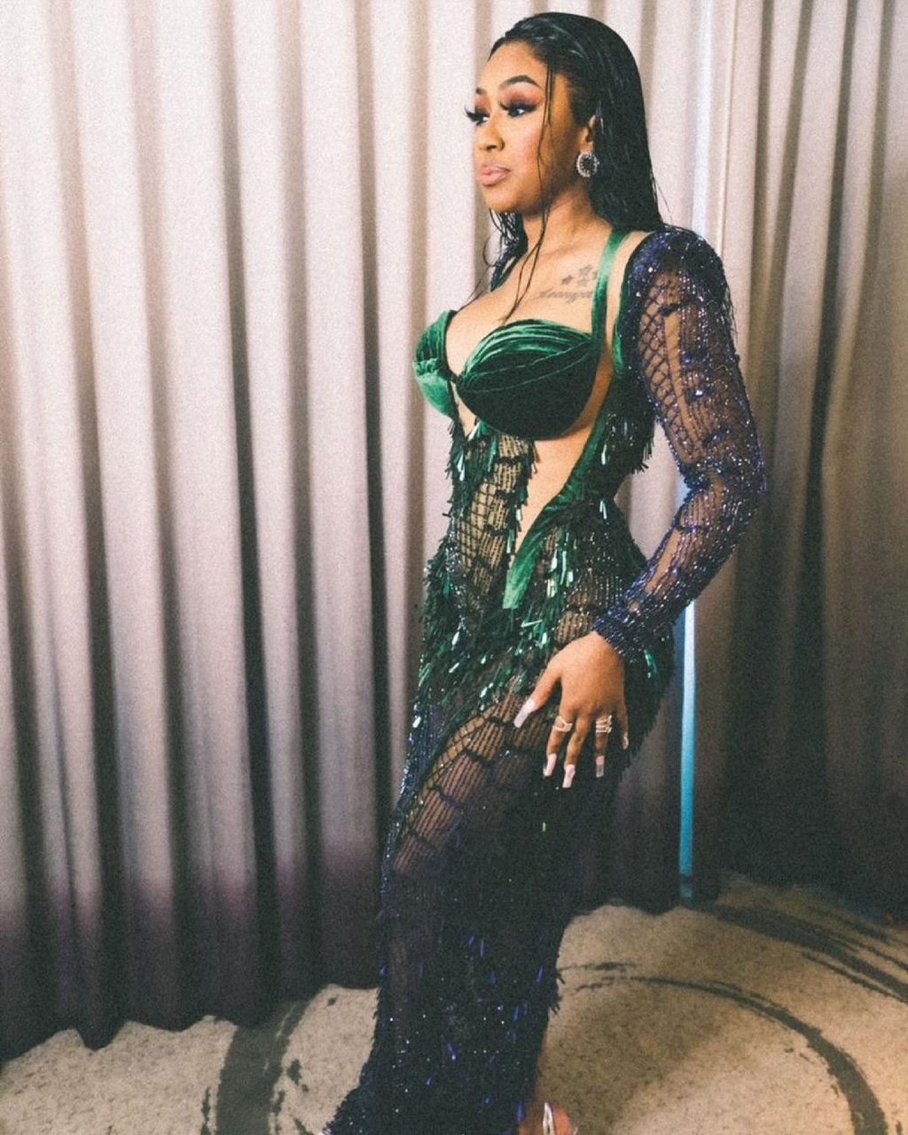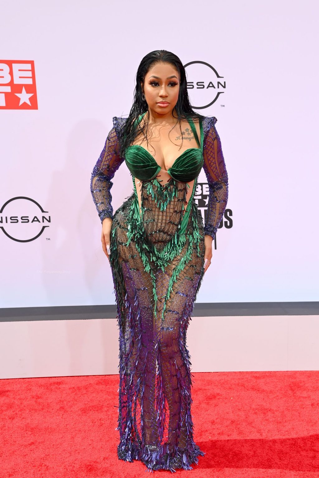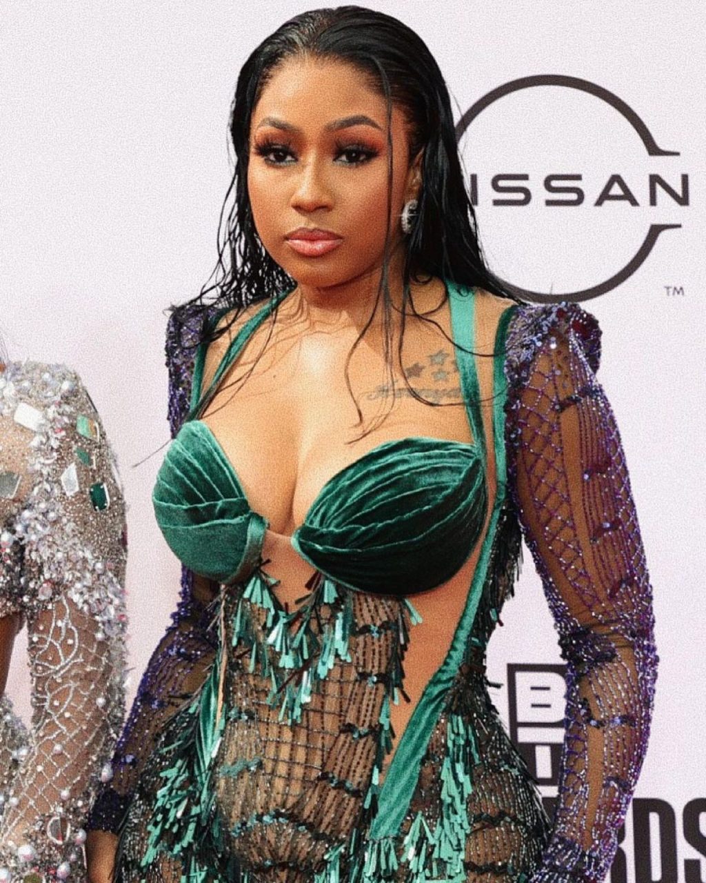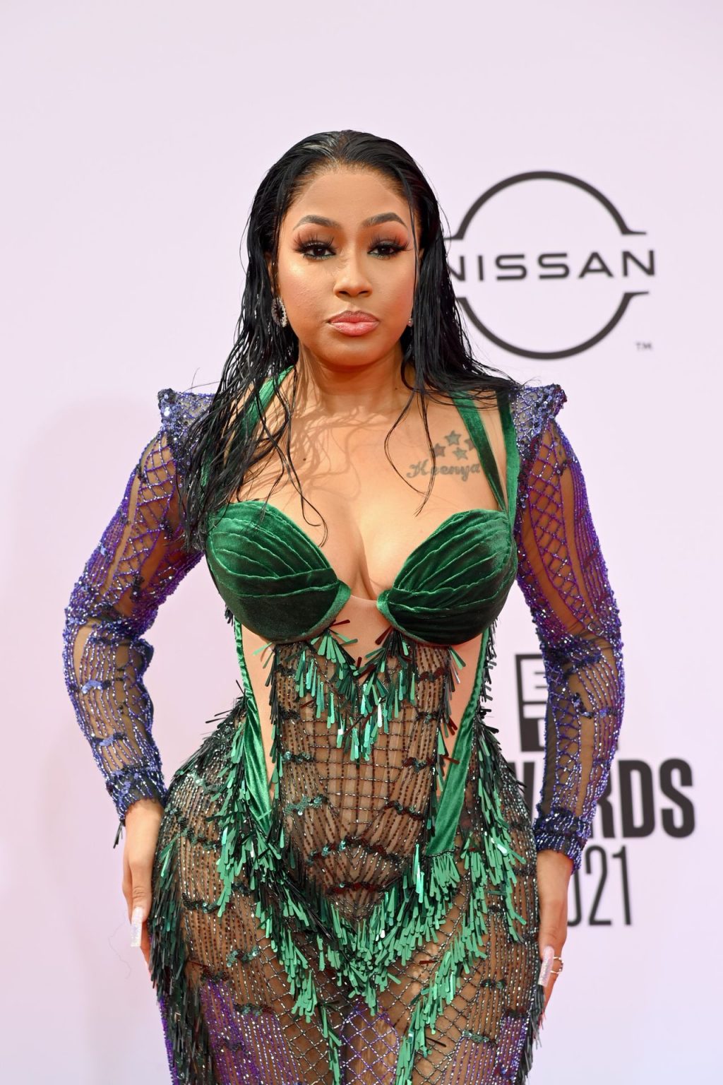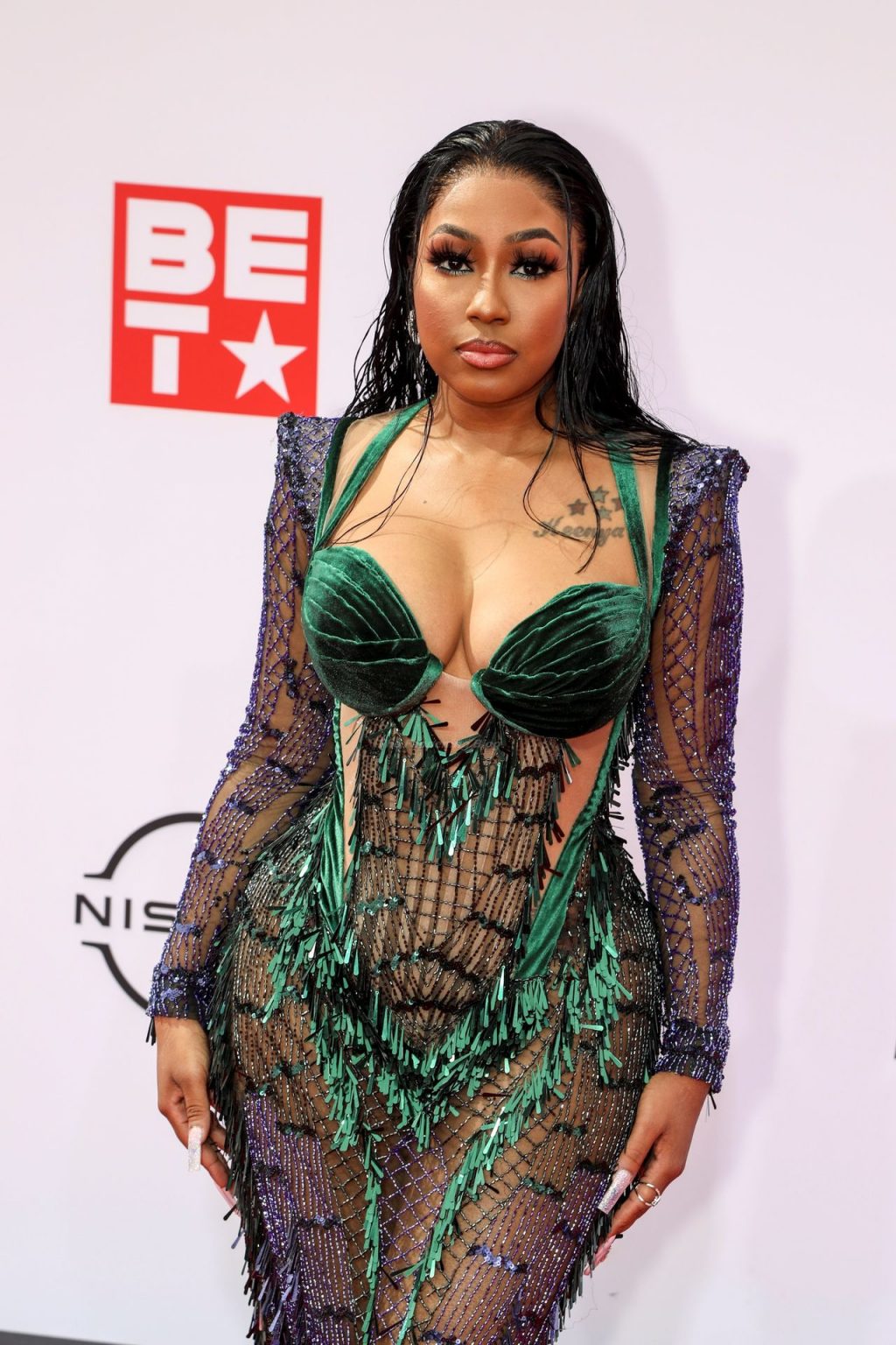 Певица Yung Miami позирует на красной дорожке в зеленом платье по прибытии на премию BET в Microsoft Theatre в Лос-Анджелесе, 27.06.2021.