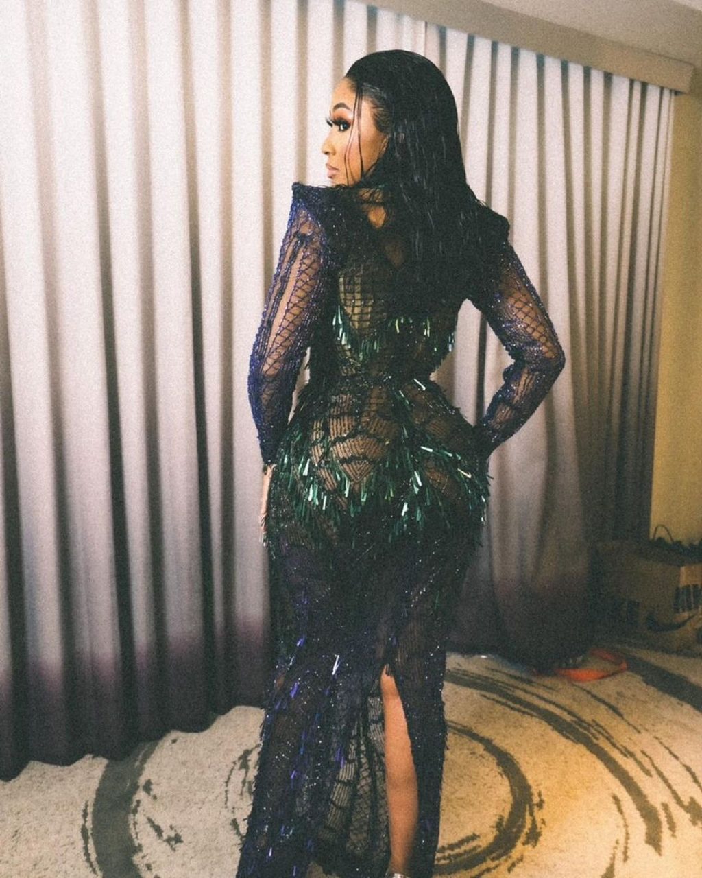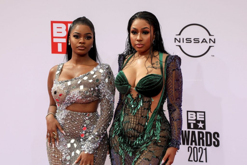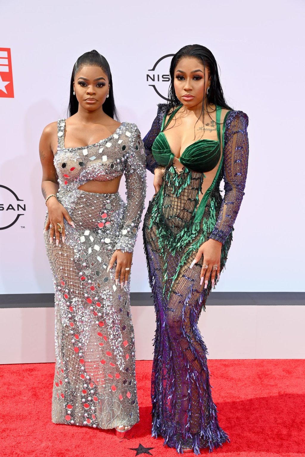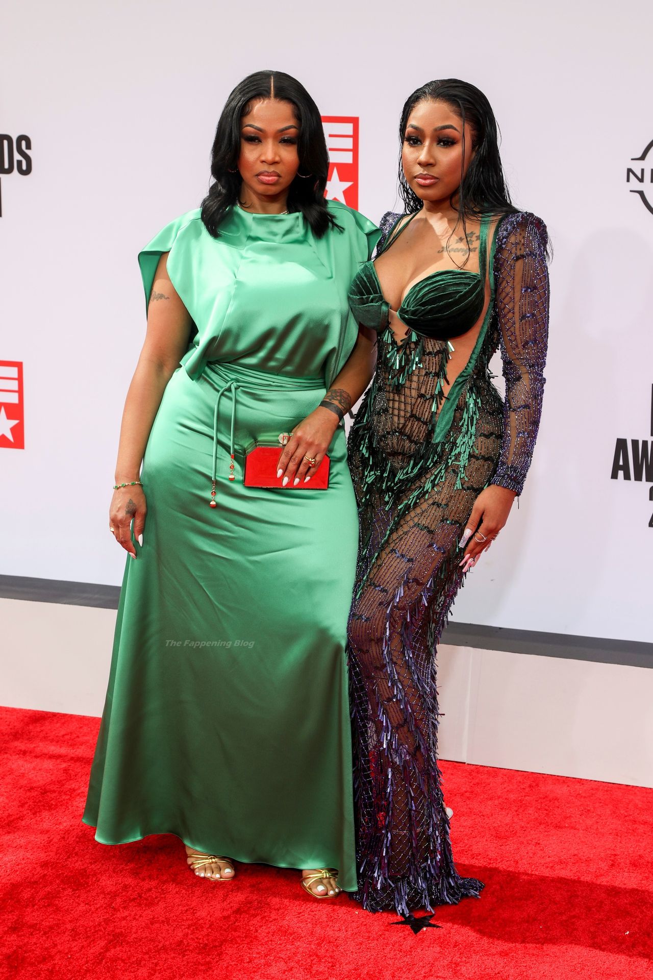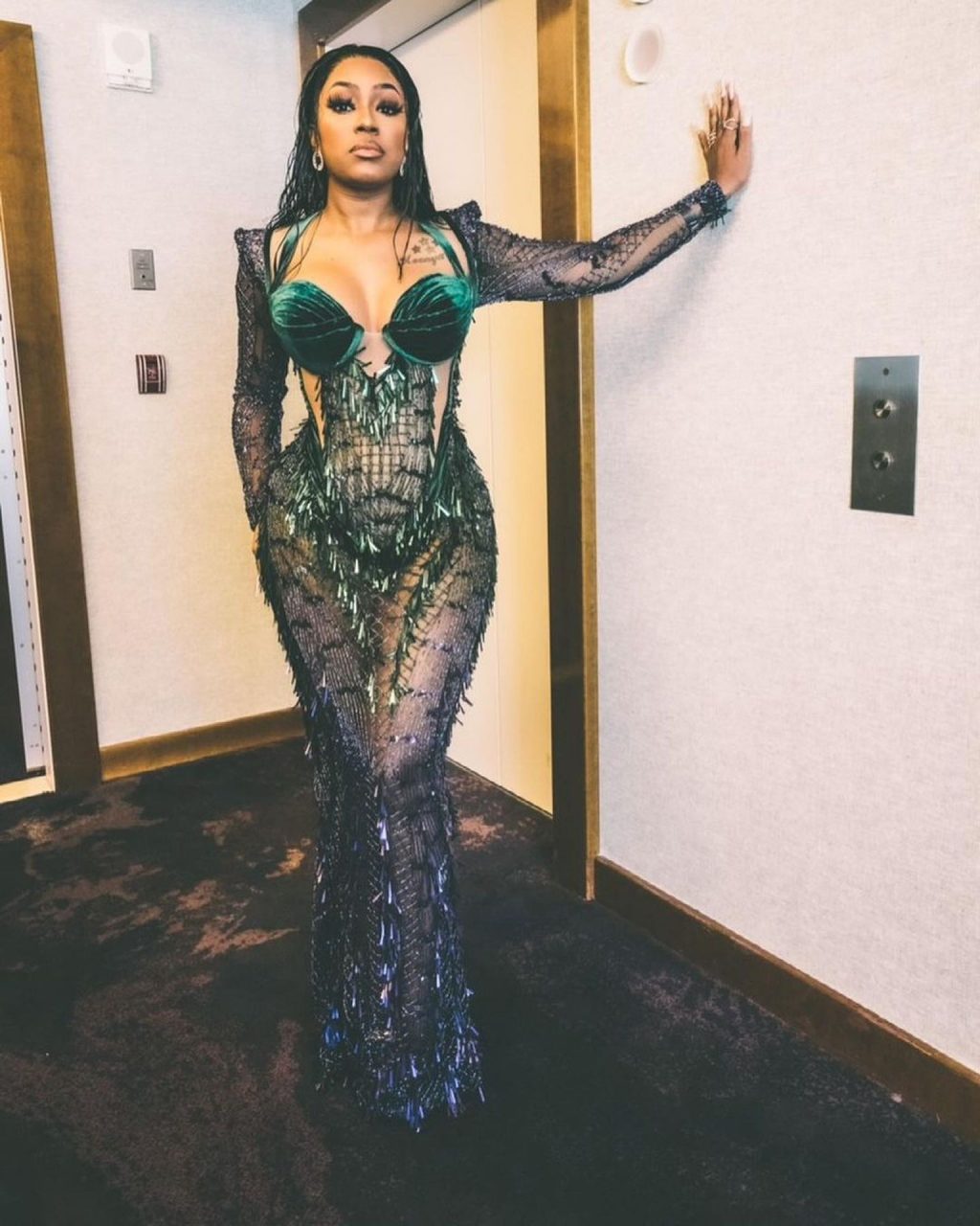 Певица Yung Miami позирует на красной дорожке в зеленом платье по прибытии на премию BET в Microsoft Theatre в Лос-Анджелесе, 27.06.2021.