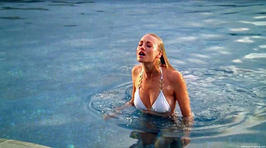 In a very sexy scene, Yvonne Strahovski swims in the pool and slowly out of the water; her white bikini is wet, and we have a nice view of her boobs and pointy nipples that outline under a tiny wet bikini. Watch Yvonne Strahovski’s hot body in the scene.