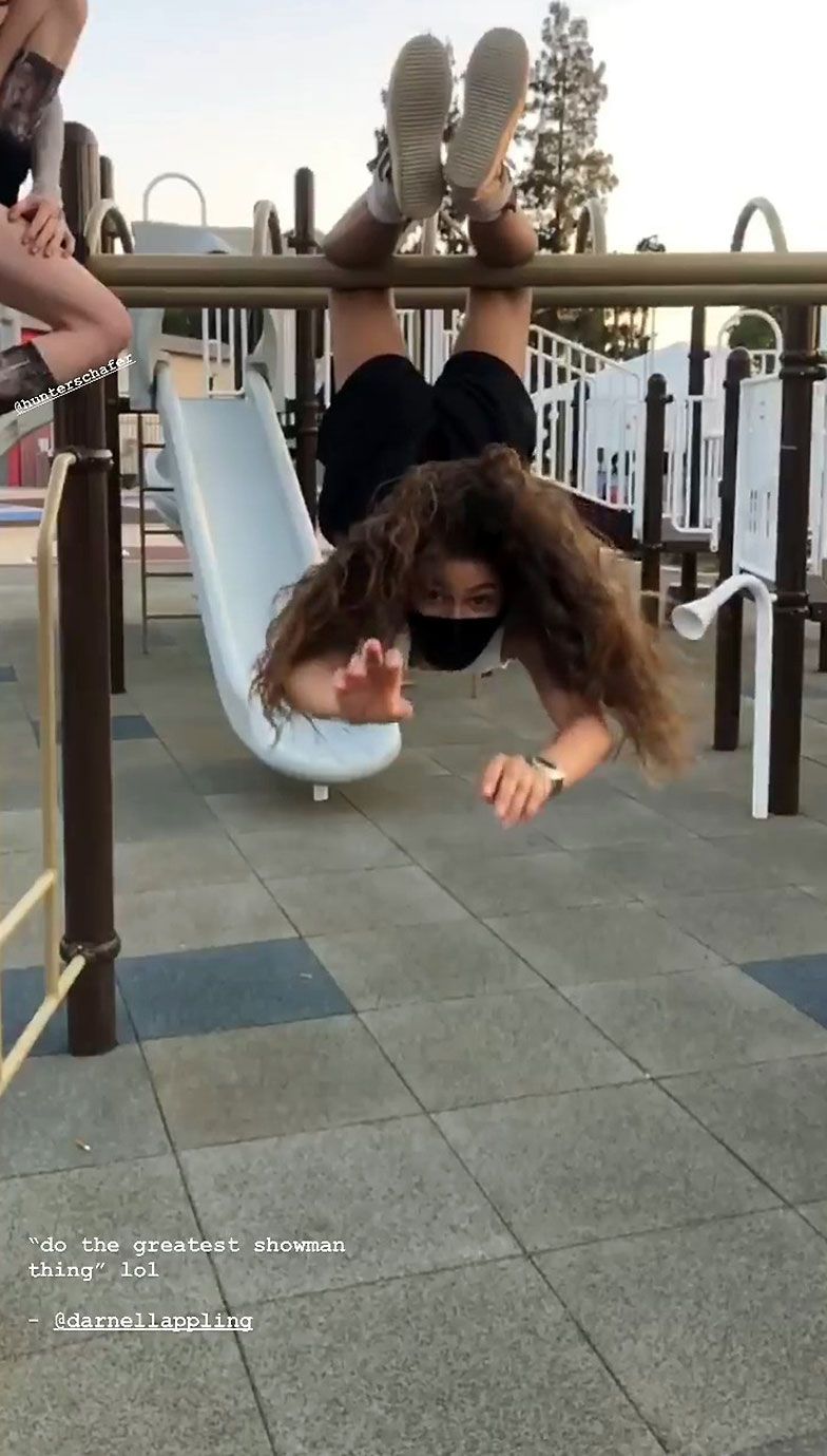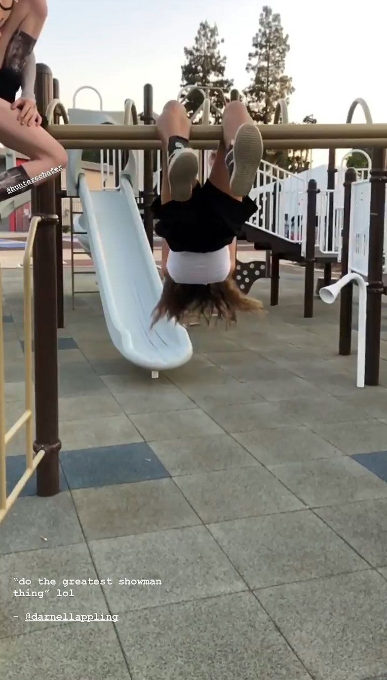 Check out how our dearest actress exercised yesterday! She found the structure that she was on at work a few days ago, and she went on about some monkey business! She wore a white tank top without a bra underneath, so her dark and perky nipples were visible to us!