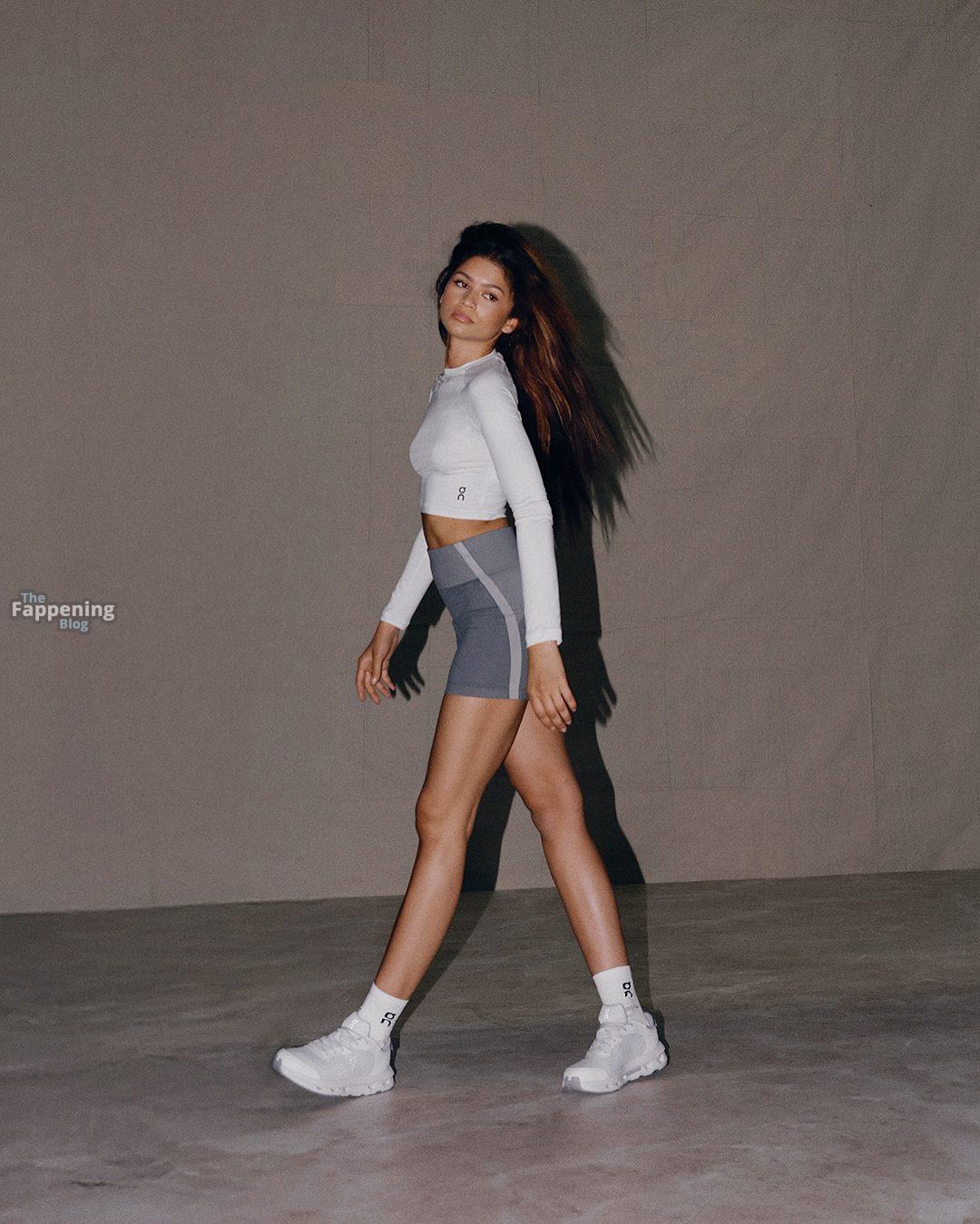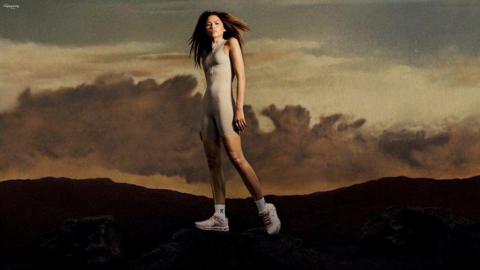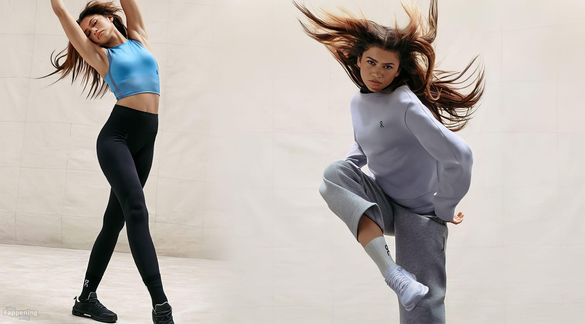 Зендая в последней кампании On, позируя в облегающей спортивной одежде, которая подчеркивает её подтянутые ноги и тонкую талию.