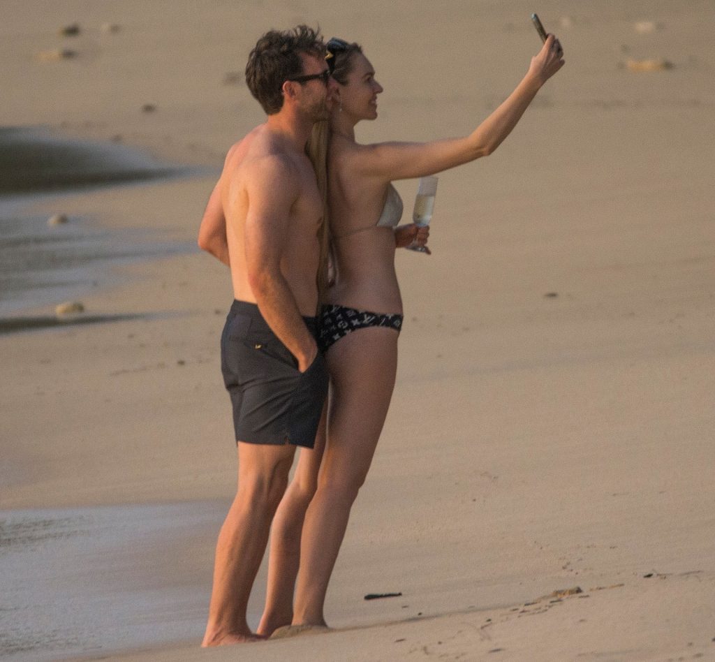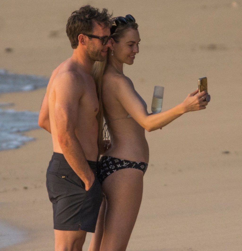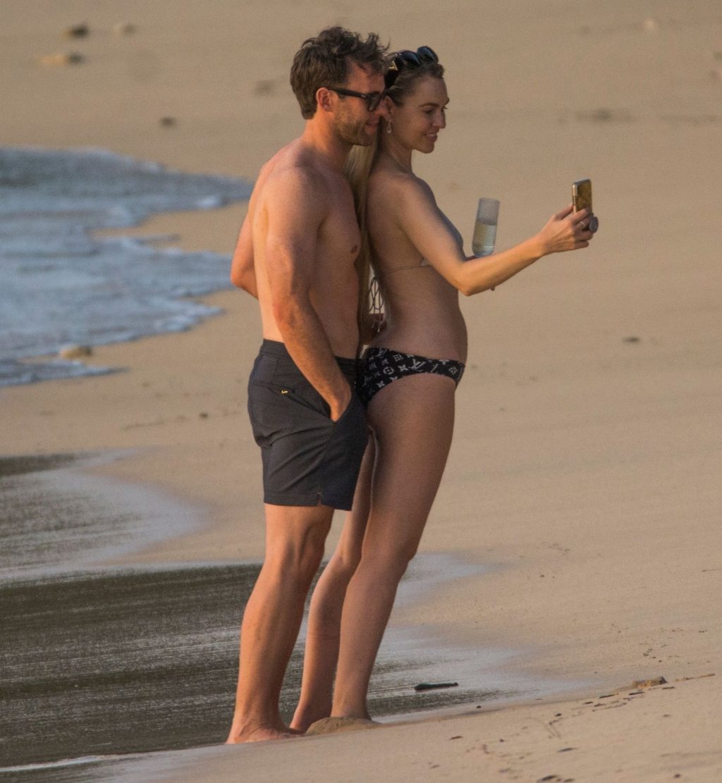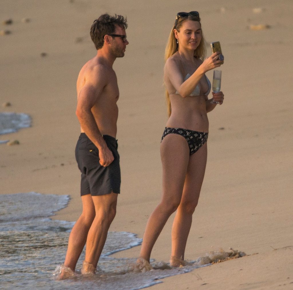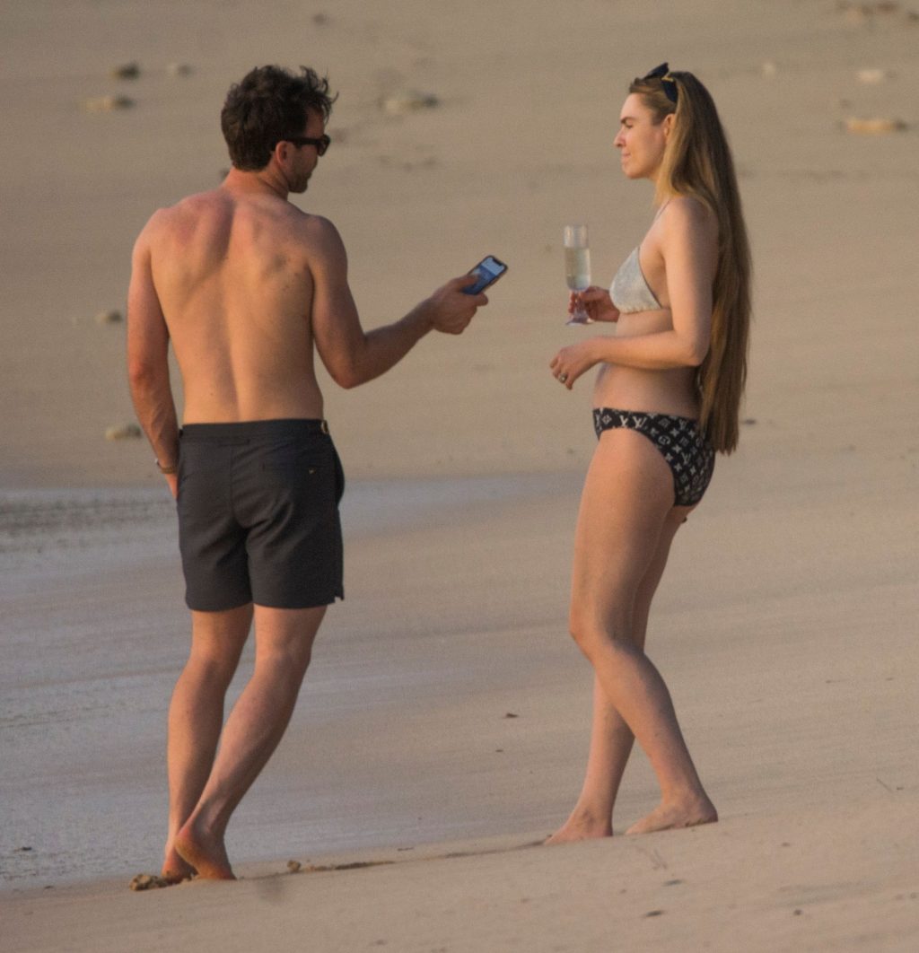 Blue Peter’s Зои Салмон демонстрирует свою стройную фигуру в разноцветном бикини, резвясь на пляже с мужем Уильямом Корри на Барбадосе, 11/02/2019. Пара наслаждалась напитками на пляже во время пребывания в шикарном отеле Sandy Lane.